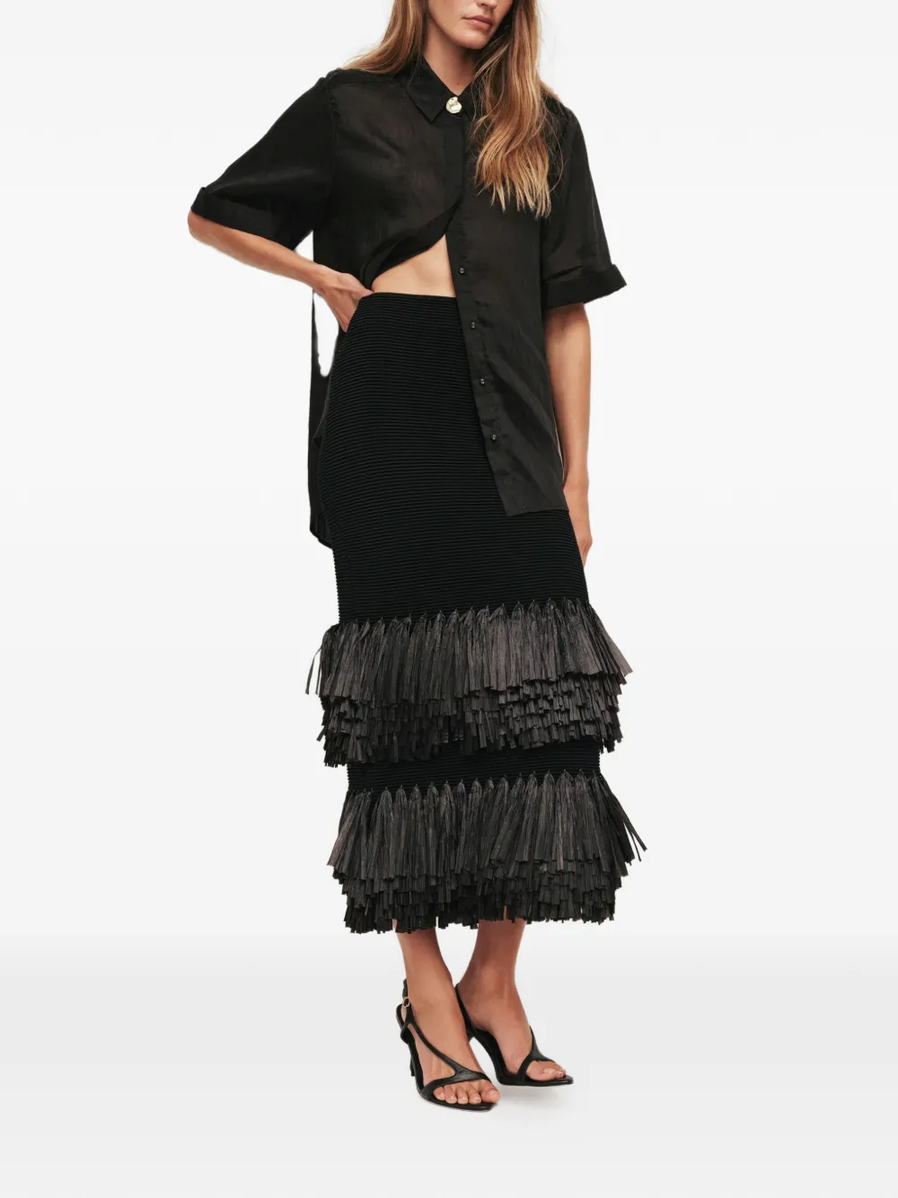 New Season Aje Agave fringed midi skirt Imported Highlights black tiered design fringed trim ribbed texture Composition Viscose 60%, Nylon 32%, Elastane 8% Washing instructions Machine Wash Product IDs FARFETCH ID: 33184156 Brand style ID: 26RE4054