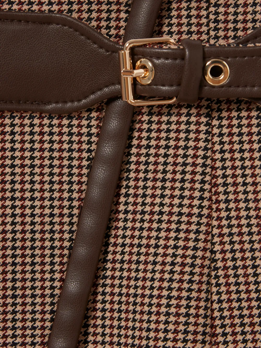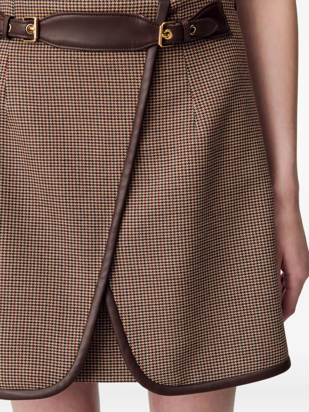 Claudie Pierlot houndstooth leather-trimmed miniskirt Imported Highlights brown houndstooth pattern leather trim wraparound style belted waist gold-tone buckle Composition Lining: Polyester 54%, Viscose 46% Outer: Polyester 68%, Viscose 29%, Elastane 3% Washing instructions Dry Clean Only Product IDs FARFETCH ID: 30452812 Brand style ID: CFPJU00794