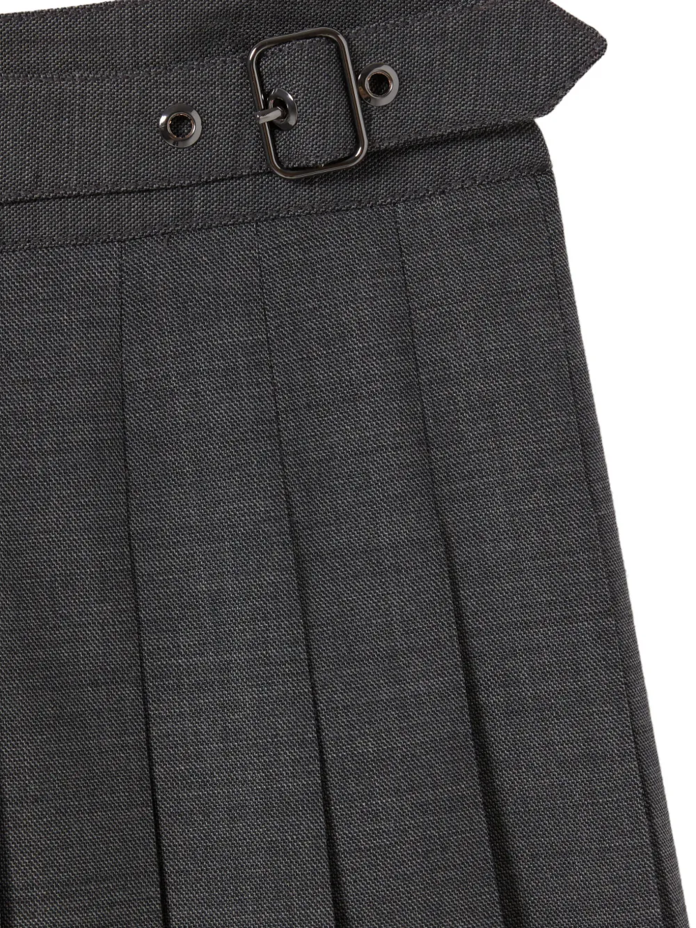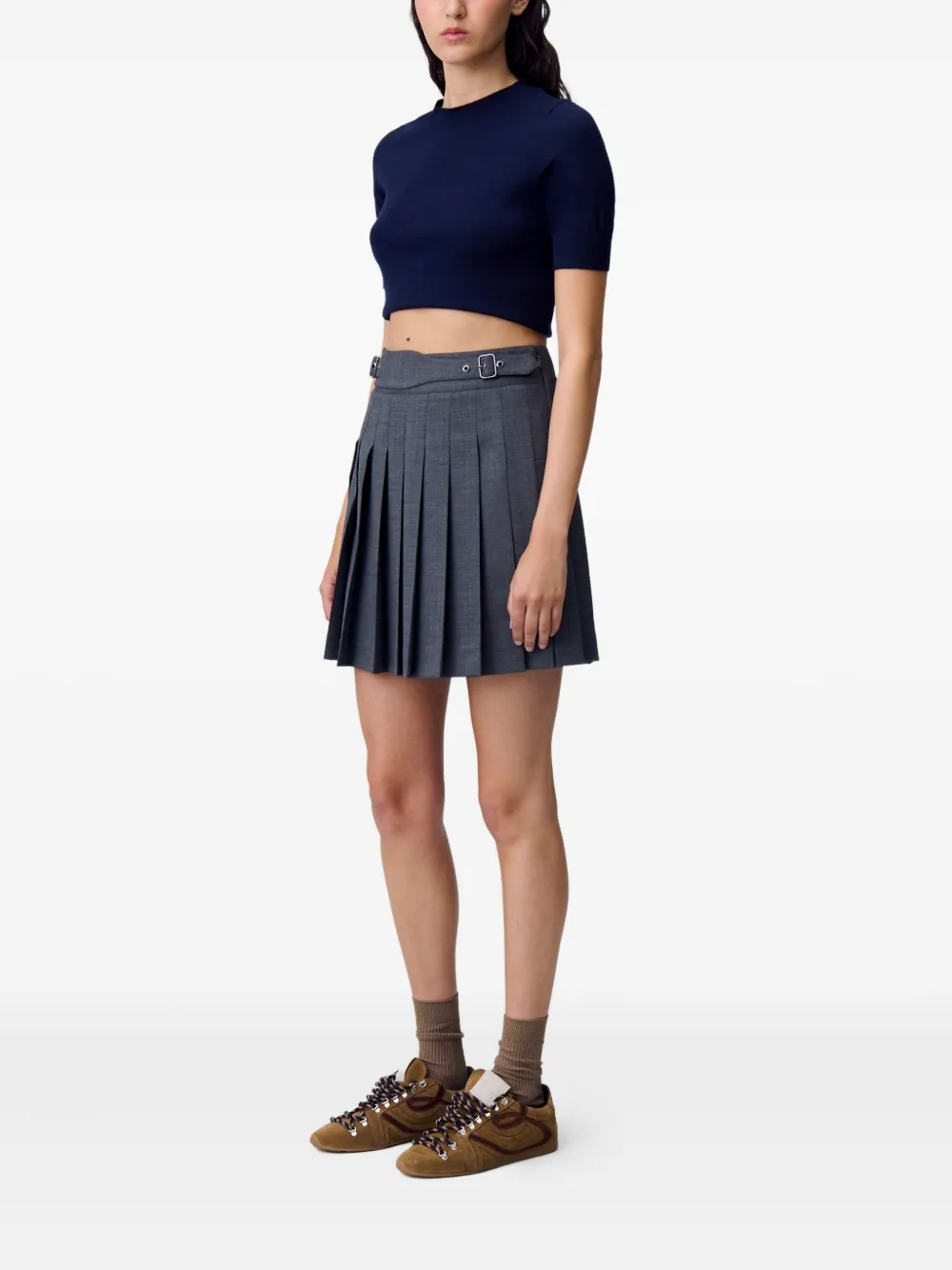 Final Sale Claudie Pierlot pleated mini skirt Imported Highlights charcoal gray high-waisted dual buckle detailing concealed side zip and hook fully pleated Composition Lining: Cotton 100% Outer: Wool 55%, Polyester 41%, Elastane 4% Washing instructions Dry Clean Only Product IDs FARFETCH ID: 30452941 Brand style ID: CFPJU00766