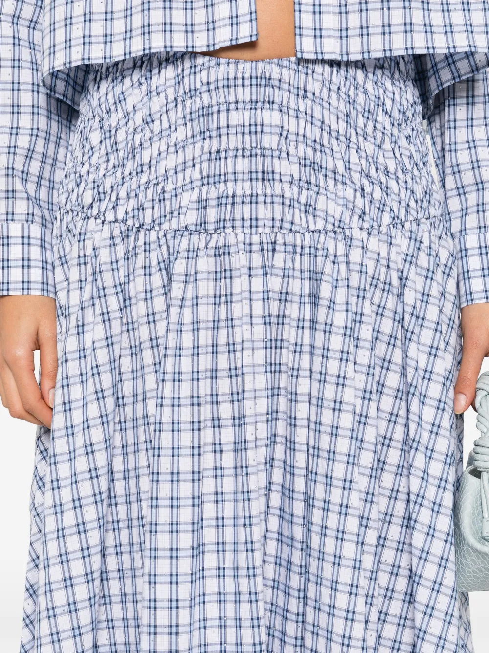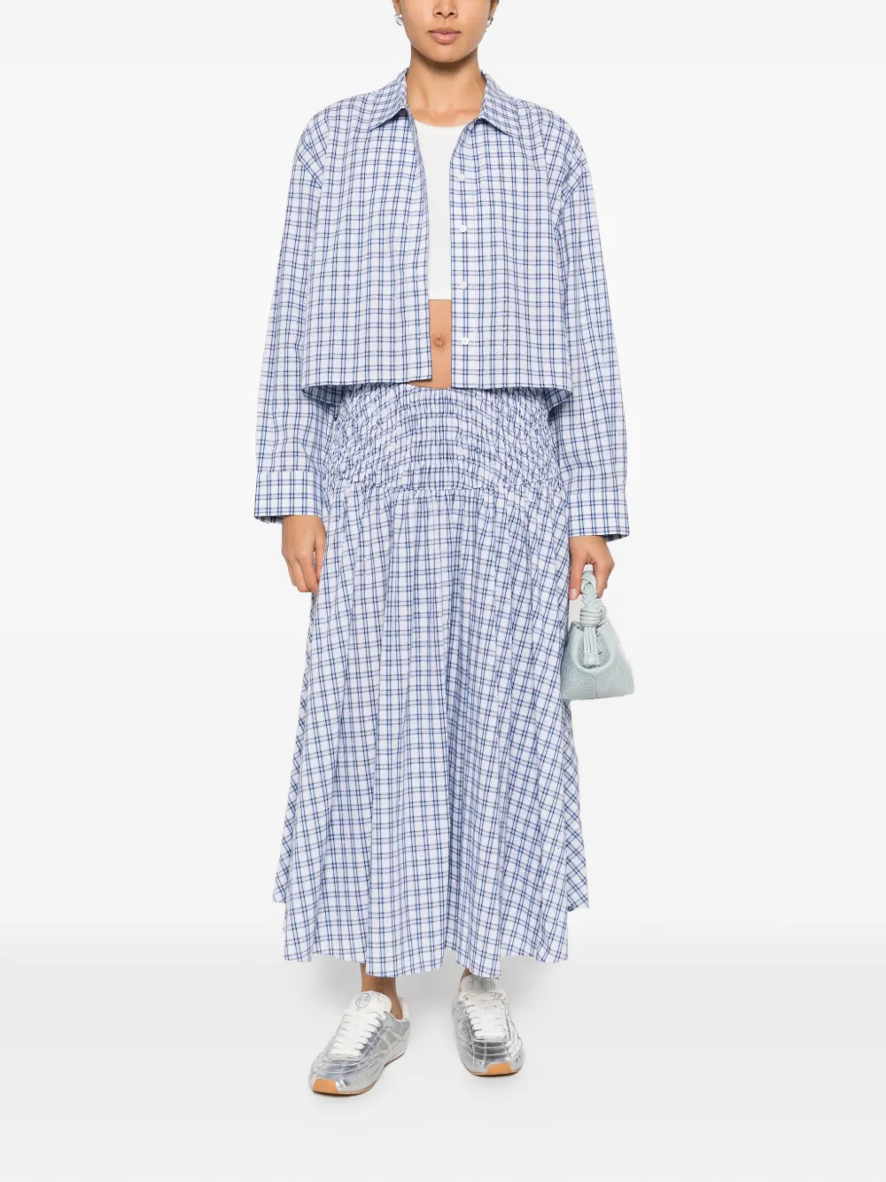 New Season Maje check-pattern A-line midi skirt Imported Highlights blue and white check print shirred panel A-line silhouette 100% cotton Composition Cotton 100% Washing instructions Read Manufacturer Guidelines Wearing The model is 5 ft 9 in. Product IDs FARFETCH ID: 32634218 Brand style ID: MFPJU01586
