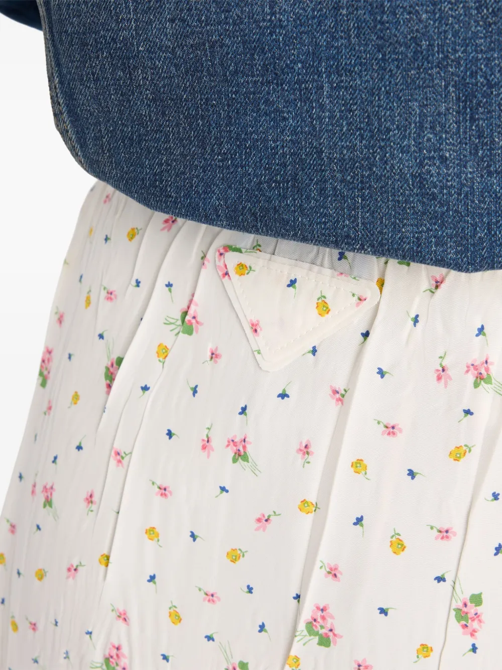 Prada floral-print skirt Highlights white/multicolour side snap closure with button triangle logo lace trim garment with slip Composition Viscose 62%, Silk 38% Washing instructions Read Manufacturer Guidelines Product IDs FARFETCH ID: 29480490 Brand style ID: P199WSOOO17K1