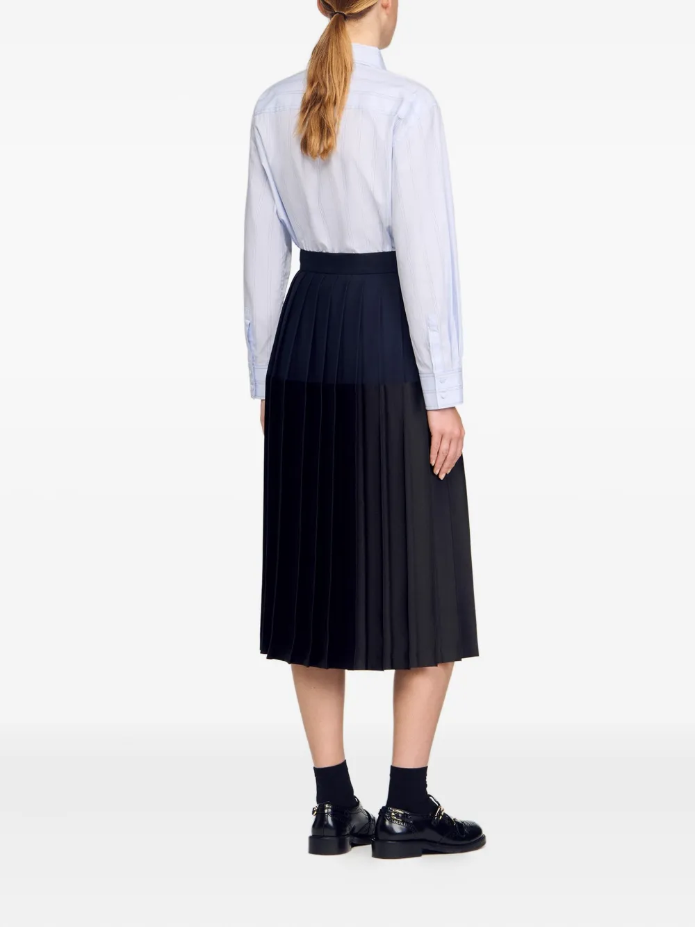SANDRO pleated colourblock midi skirt Imported Highlights black and blue colourblock design pleated Composition Polyester 100% Washing instructions Read Manufacturer Guidelines Product IDs FARFETCH ID: 29913907 Brand style ID: SFPJU01485