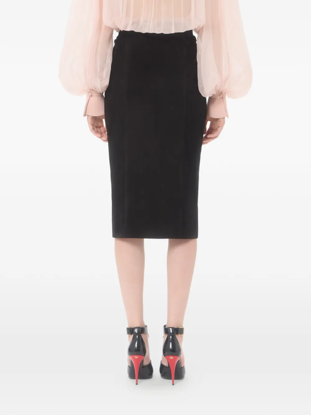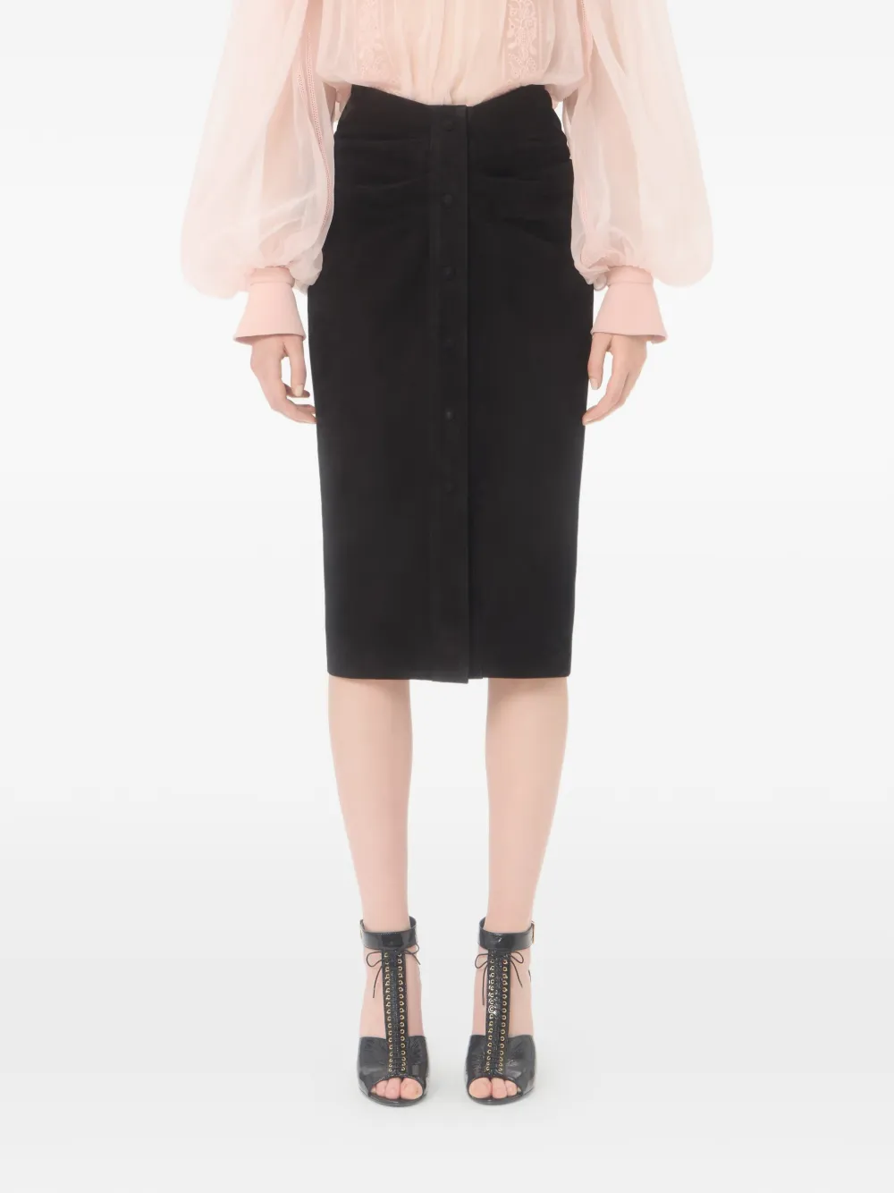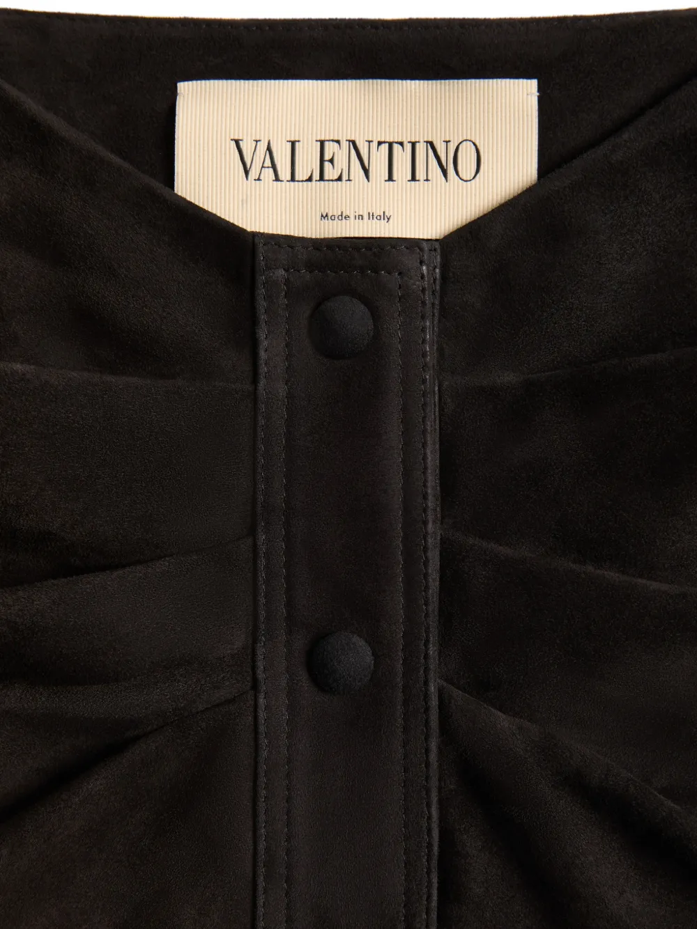 Suede skirt with buttons- Gathered detail at the waist- Overlapping front slit - Suede (100% Goat Leather) - Flower, Stripes, and VLogo lining (74% Acetate, 26% Silk) - Length: 74 cm / 29.1 in. from the center back in an Italian size 40 - The model is 176 cm / 5'9" tall and wears an Italian size 40