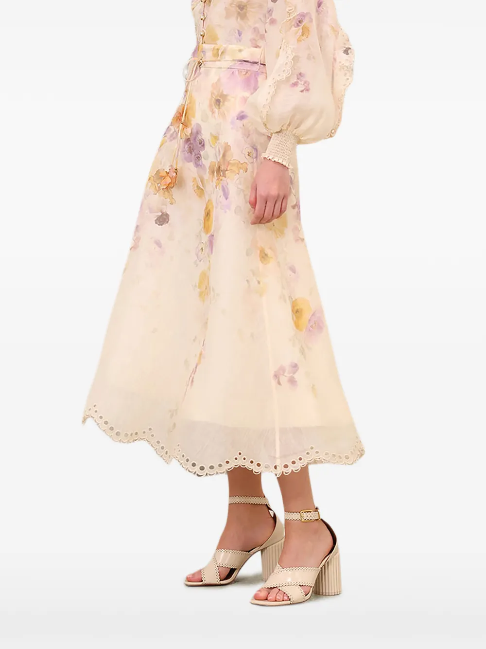 ZIMMERMANN Memento embroidered midi skirt Imported Highlights beige floral print eyelet trim drawstring waist tie waist scalloped hem Composition Outer: Linen/Flax 53%, Silk 47% Lining: viscose 100% Washing instructions Read Manufacturer Guidelines Product IDs FARFETCH ID: 31851427 Brand style ID: 5460SF252